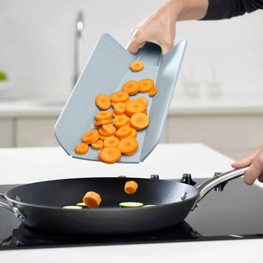 Chop2Pot™ est la solution innovante pour transférer une variété d'aliments hachés dans des casseroles, des poêles et, dans le cas des épluchures, des bacs à compost. Posée à plat, sa surface antidérapante adaptée aux couteaux est parfaite pour tous les types de préparation alimentaire. D'une simple pression sur la poignée, les côtés de la planche à découper se replient pour créer une goulotte pour verser facilement, assurant moins de dégâts et une préparation plus efficace des repas.