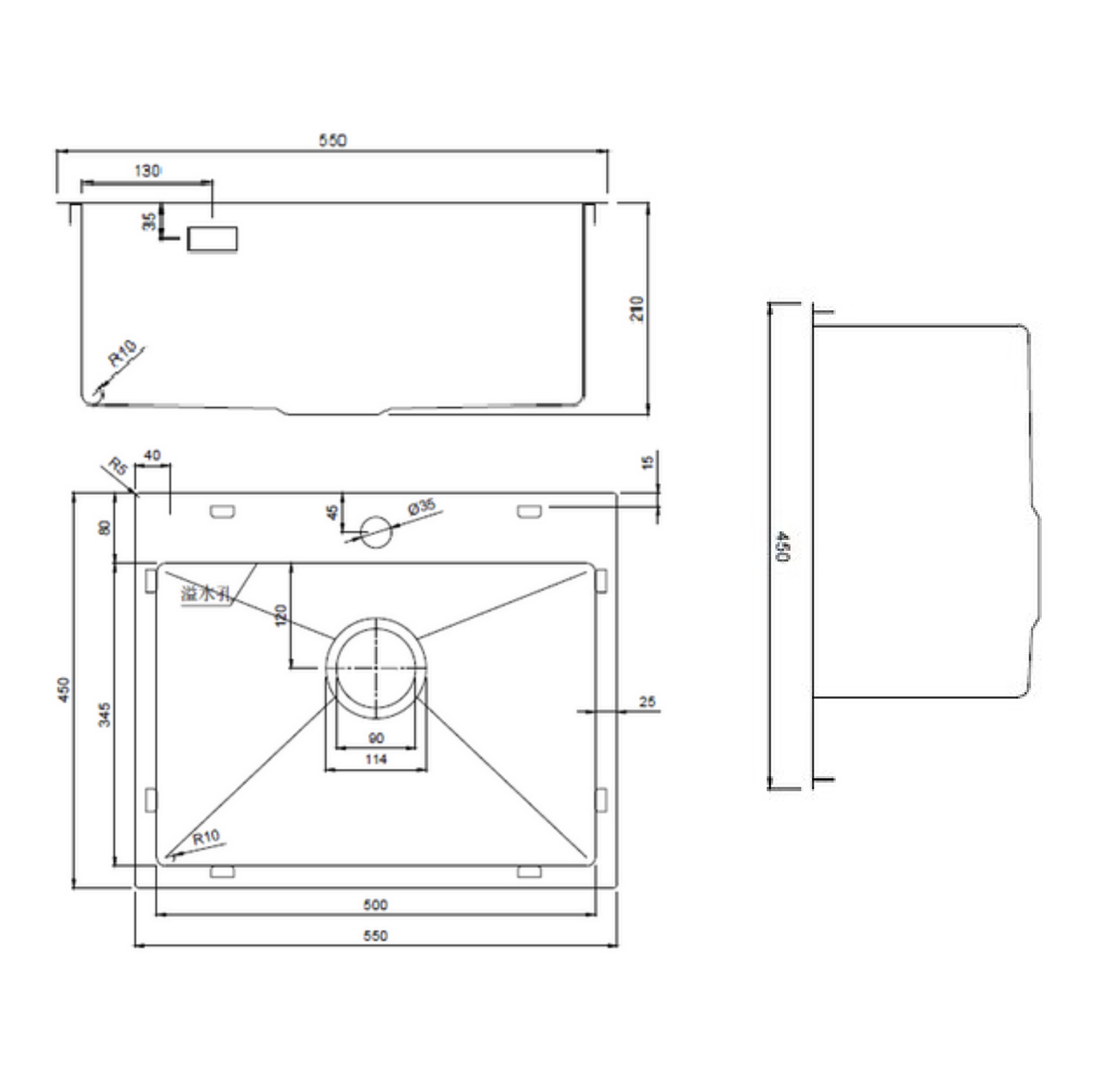 Caractéristiques de l'évier à encastrer en acier inoxydable 304, 55x45x21 cm, avec trop plein, cuivre brossé PVD (TMLKST-5545BCP):