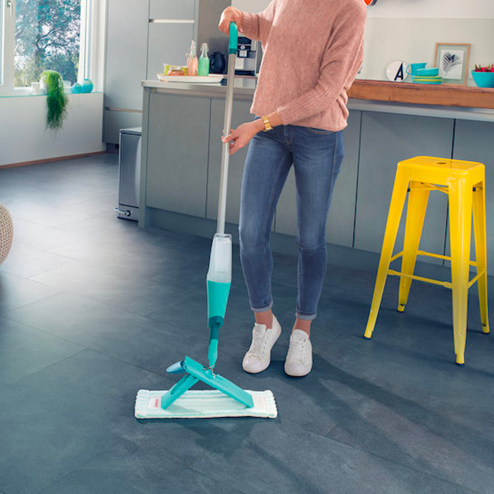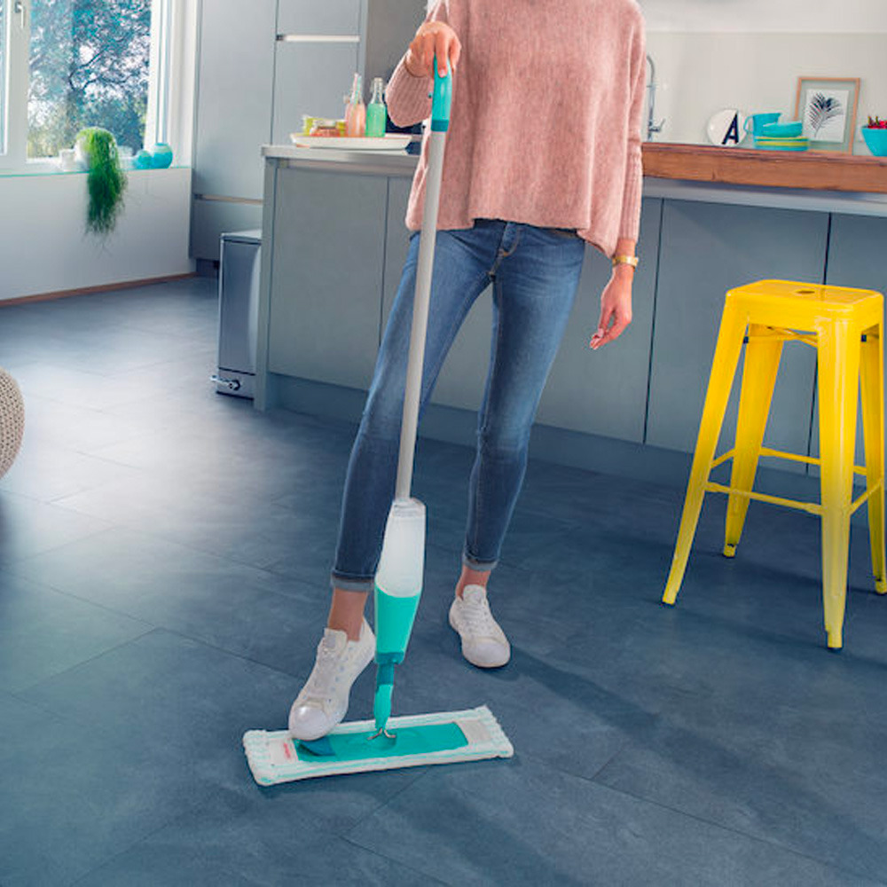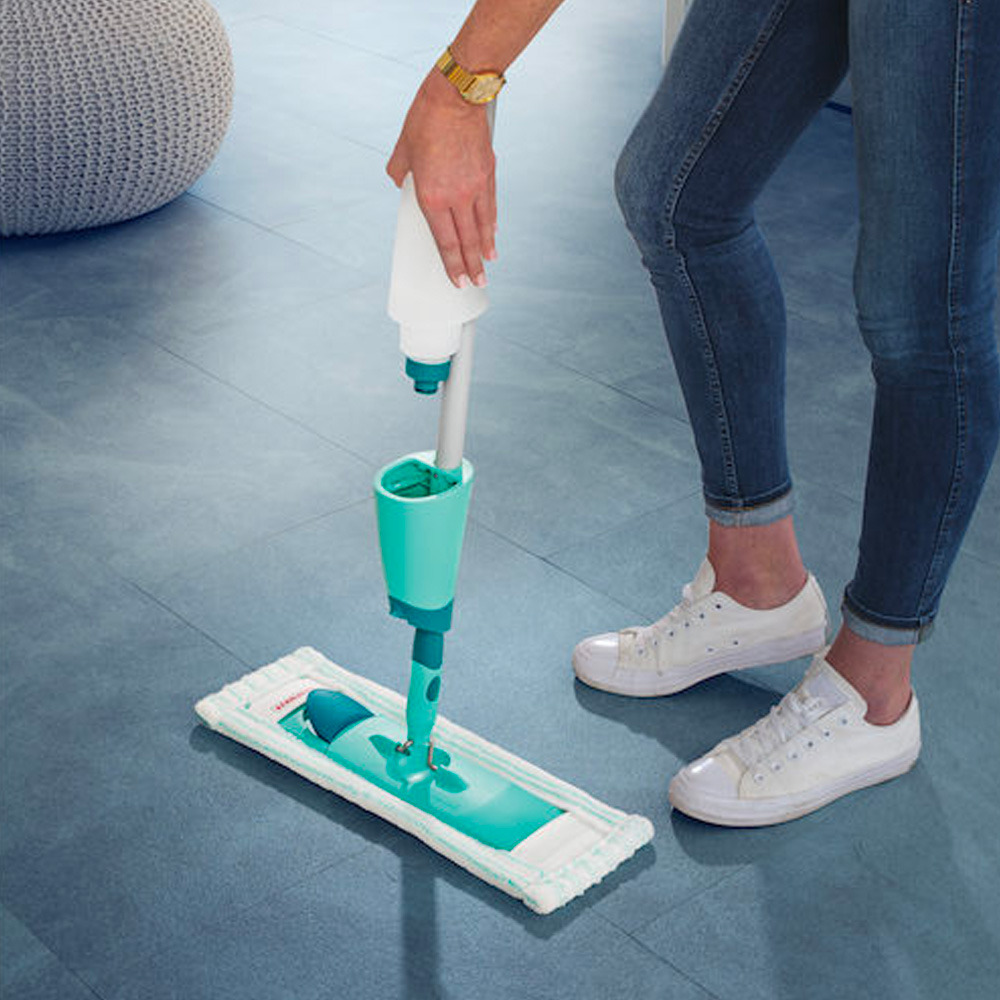 - Utilisation de détergent favorisé : l’eau, produit ménager préparé par soi-même ou une recharge de produit nettoyant prête à l'emploi de Leifheit pour différents sols