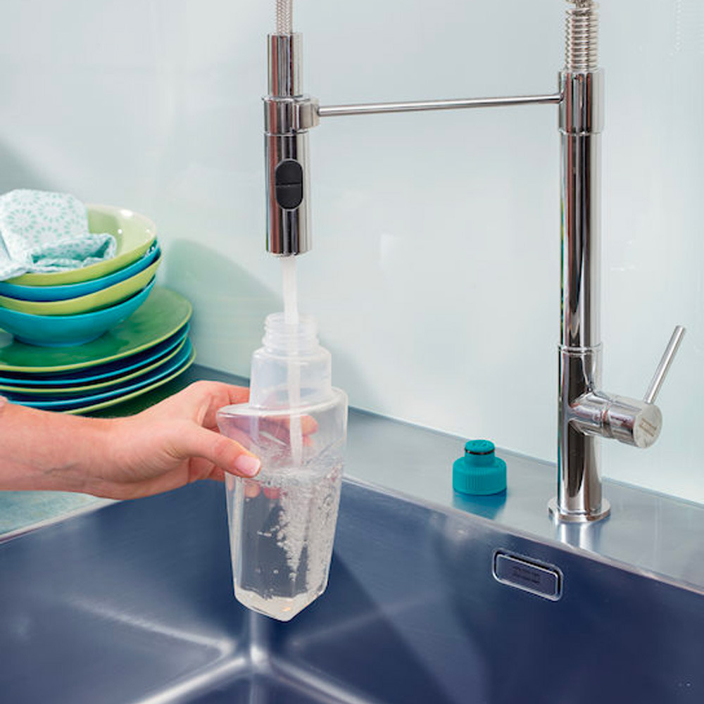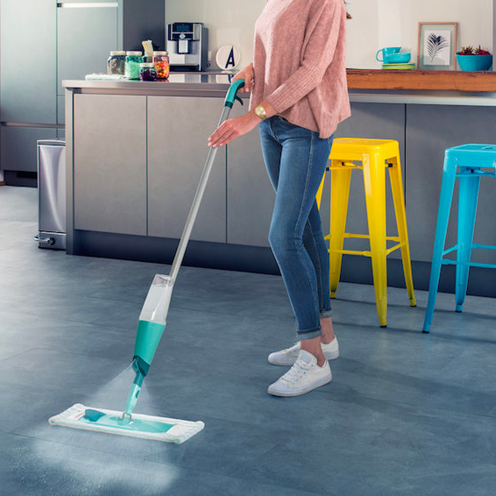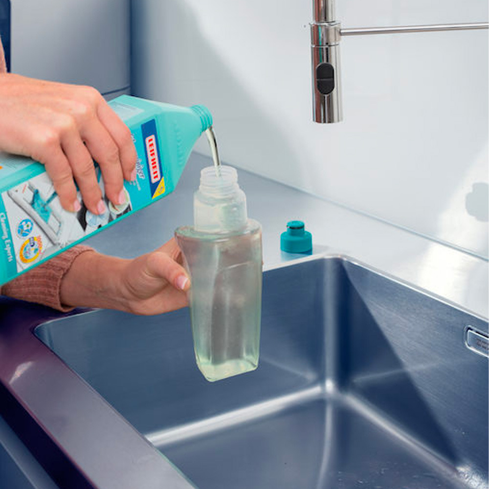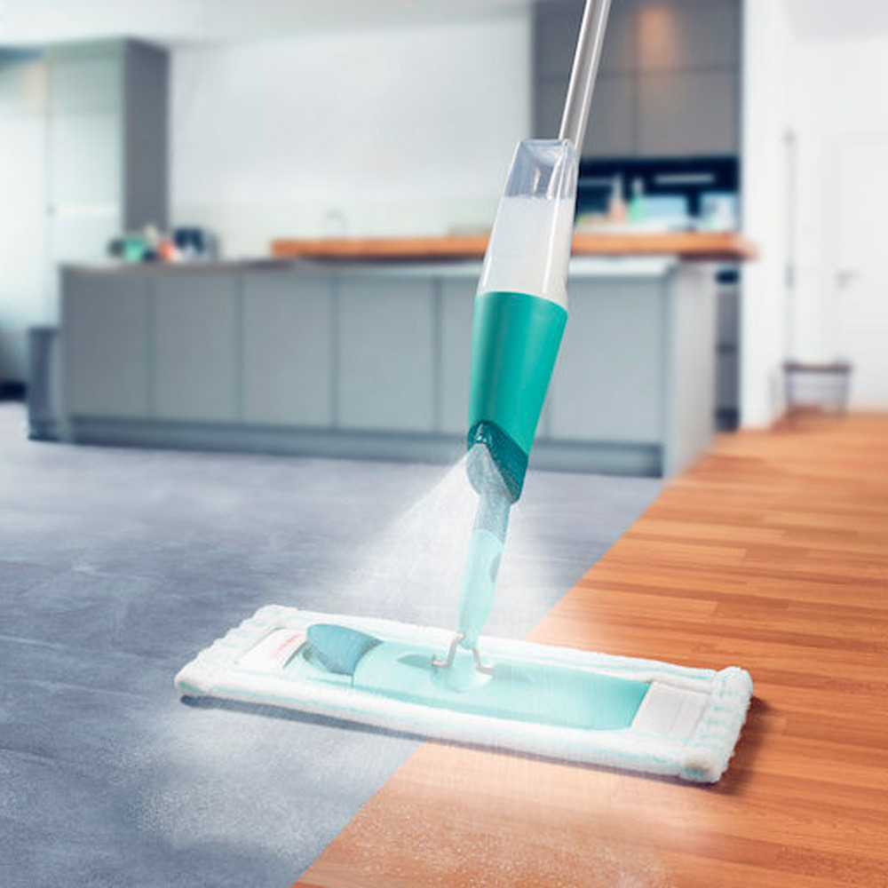 - Utilisation de détergent favorisé : l’eau, produit ménager préparé par soi-même ou une recharge de produit nettoyant prête à l'emploi de Leifheit pour différents sols