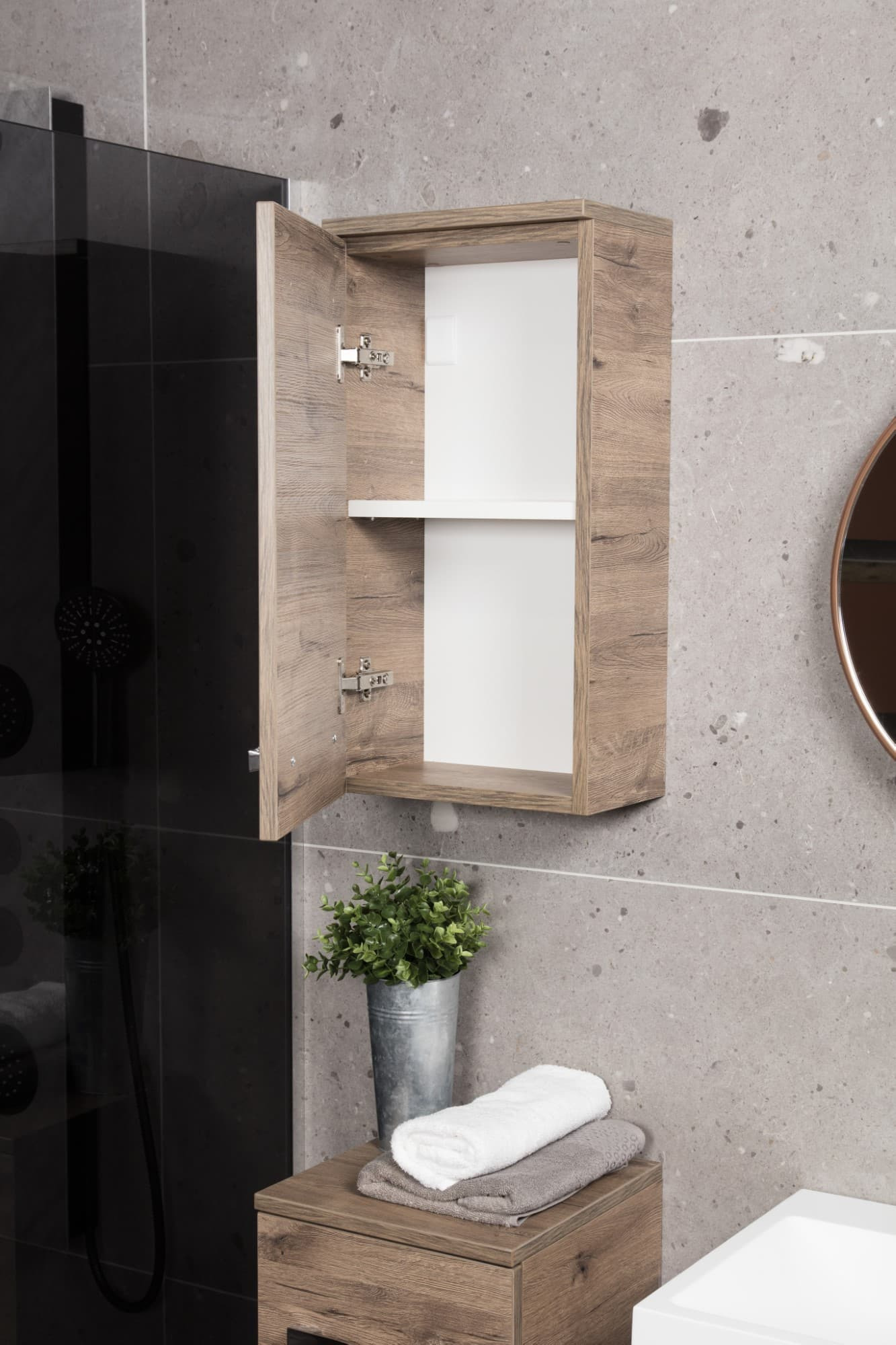 Armoire suspendue pour la salle de bain. La porte peut être tournée pour changer l'option d'ouverture à gauche/droite.