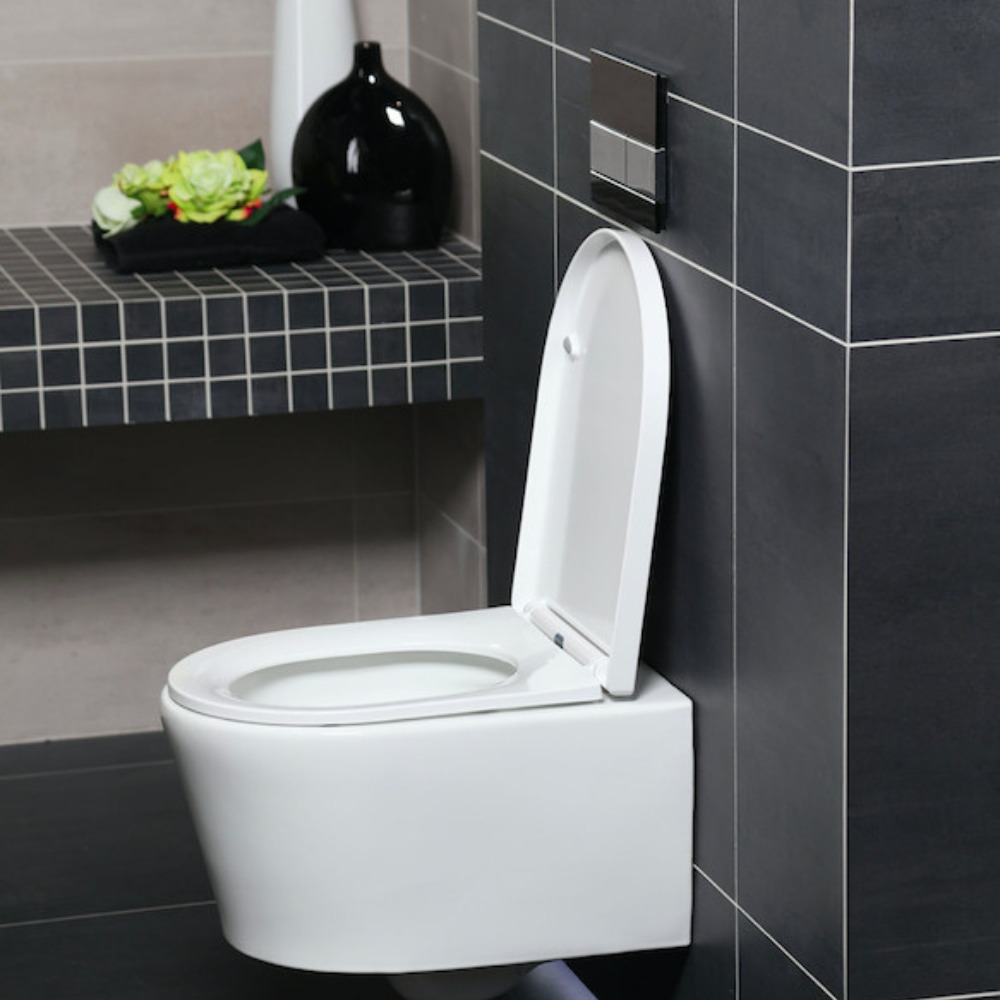 Cuvette suspendue sans bride et fixations invisibles + abattant frein de chute Swiss Aqua Technologies (SATBRE010RREXP) :
