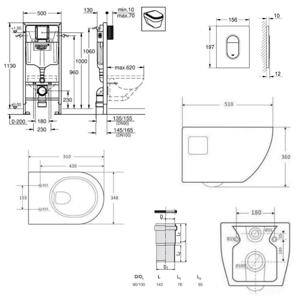 Grohe Pack WC Bâti-support Rapid SL + WC SAT sans bride + Abattant SoftClose + Plaque chrome + Set d'habillage (ARENAPROJECTSB)