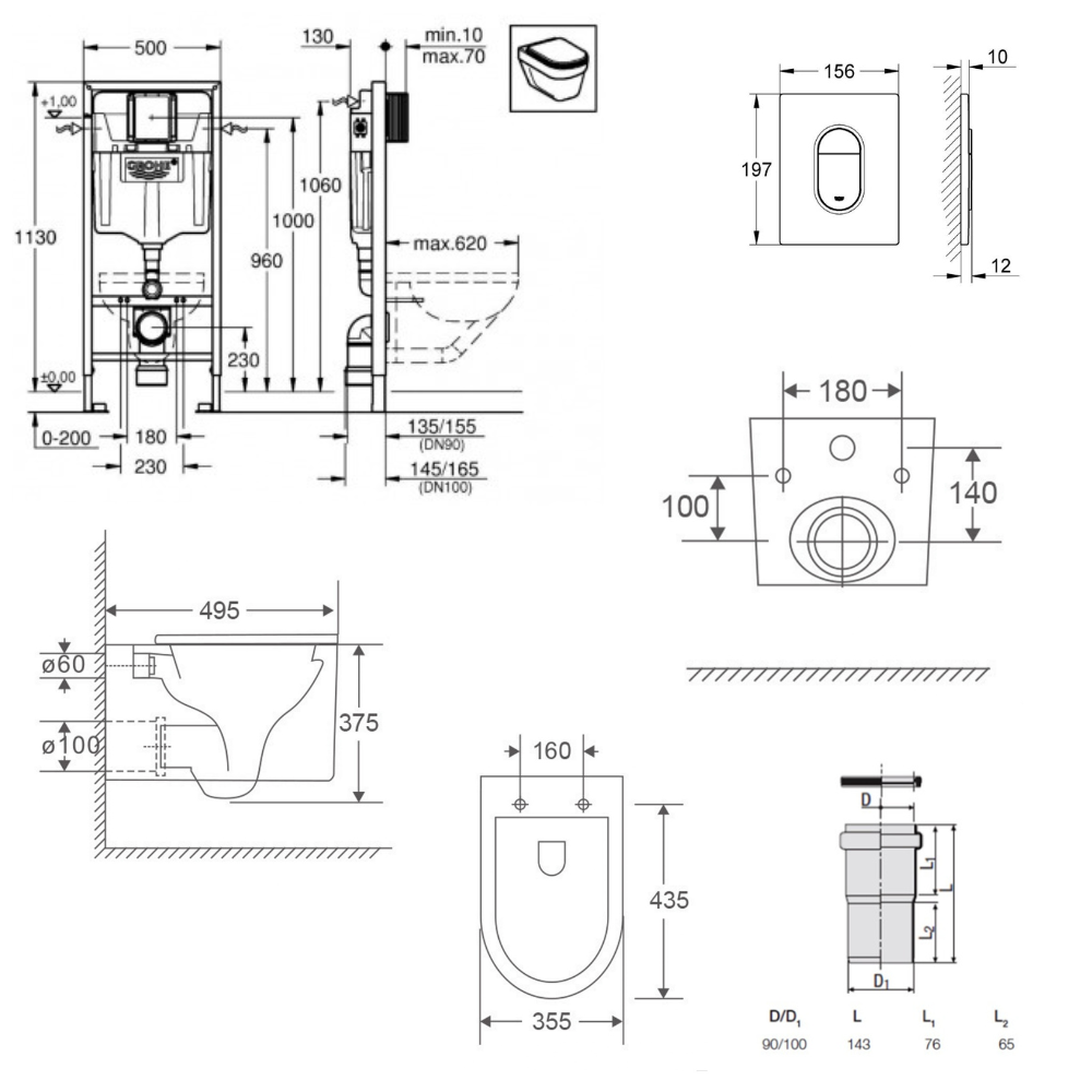 Grohe Pack WC Bâti Rapid SL + WC sans bride SAT Tornado Quiet + Abattant SoftClose + Plaque chrome + Set d'habillage (ARENADELANOTQSB)