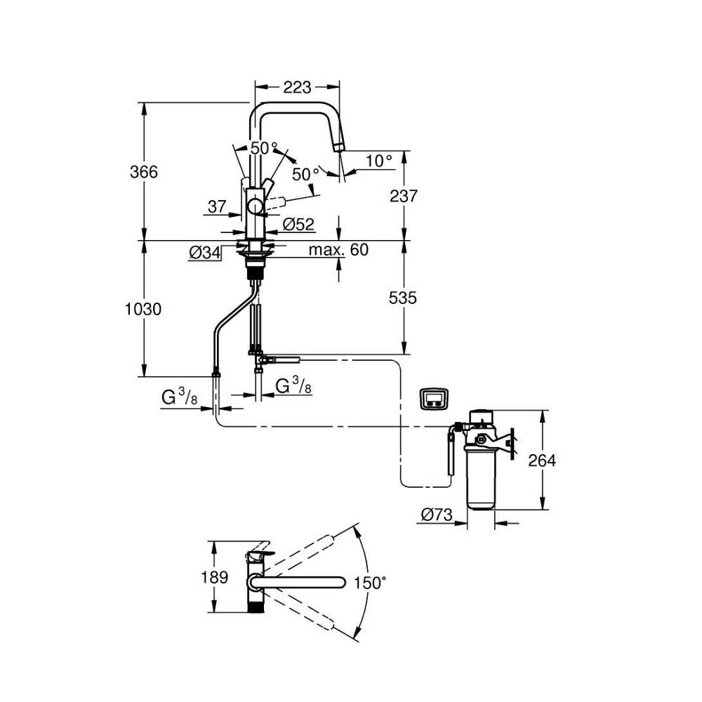Caractéristiques du mitigeur évier avec fonction filtration + Kit de démarrage avec filtre à charbon actif, chrome Grohe Blue Pure Start (G30596000) :