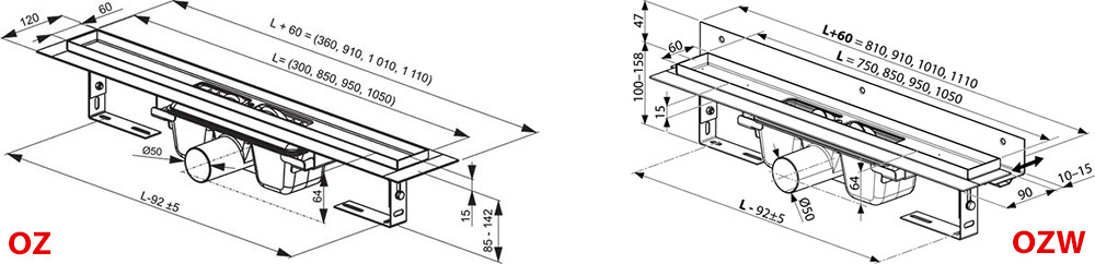 Dans le cas d'une combinaison de la cabine de douche avec le canal de drainage, il est nécessaire de prendre en compte les dimensions des produits individuels. Les dimensions exactes des cabines de douche sont indiquées sur les produits individuels dans la fiche technique.