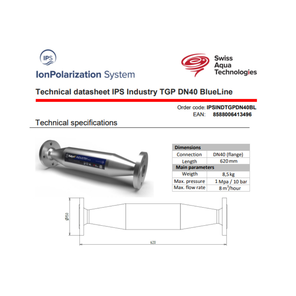 Caractéristiques de l'adoucisseur d'eau Industriel Anticalcaire Antibactérien innovant IPS Kalyxx BlueLine DN40 Swiss Aqua Technologies (IPSINBDN40P) :