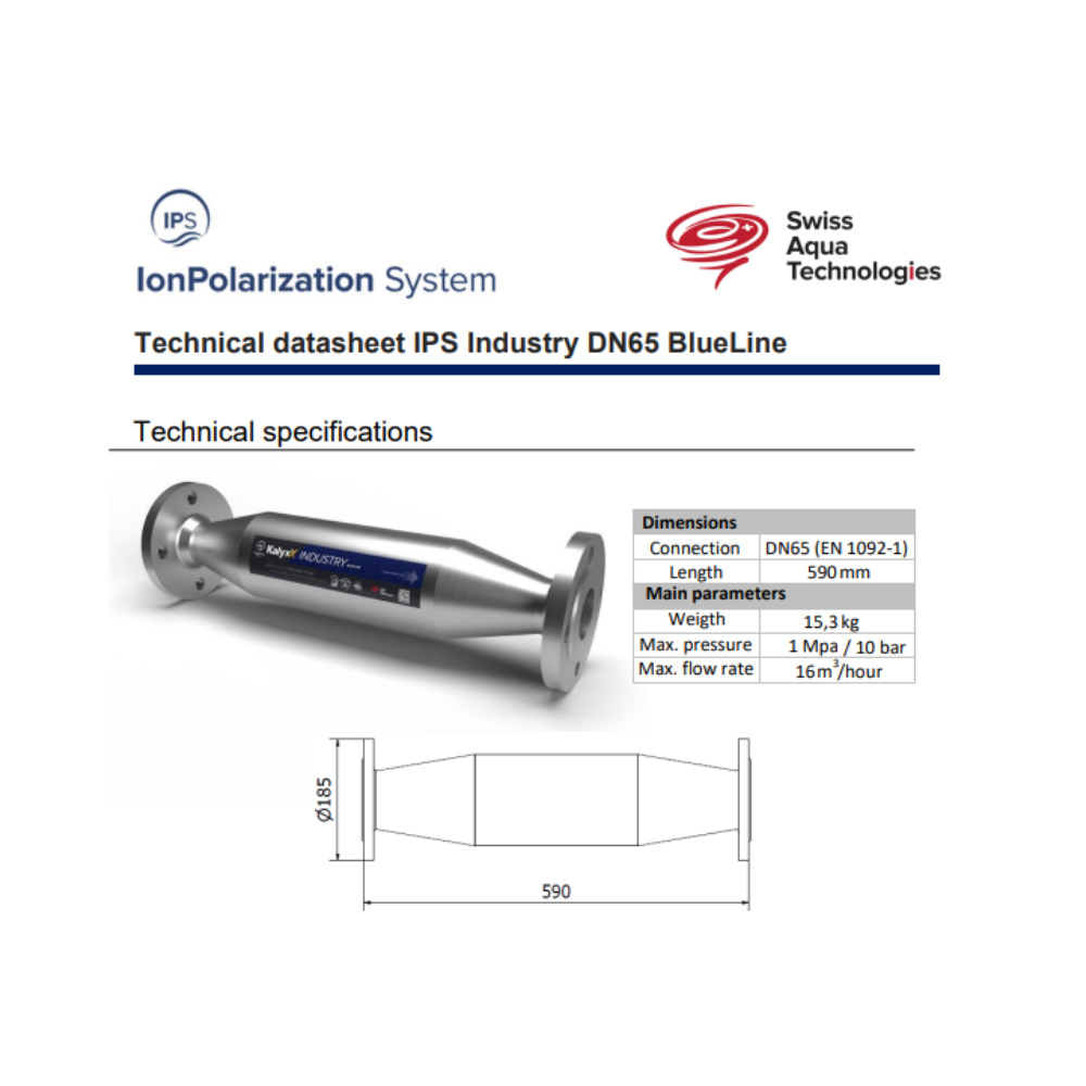 Caractéristiques de l'adoucisseur d'eau Industriel Anticalcaire Antibactérien innovant IPS Kalyxx BlueLine DN65 Swiss Aqua Technologies (IPSINBDN65P) :