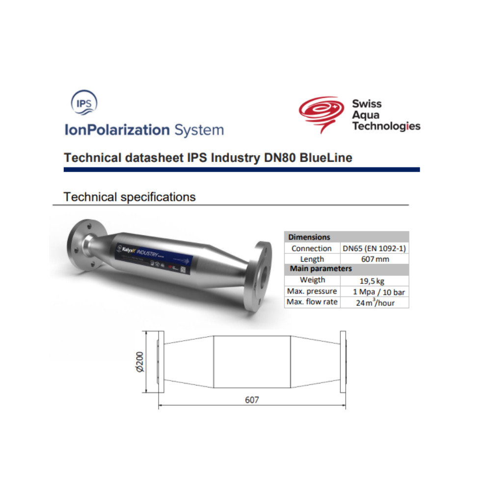 Caractéristiques de l'adoucisseur d'eau Industriel Anticalcaire Antibactérien innovant IPS Kalyxx BlueLine DN80 Swiss Aqua Technologies (IPSINBDN80P) :