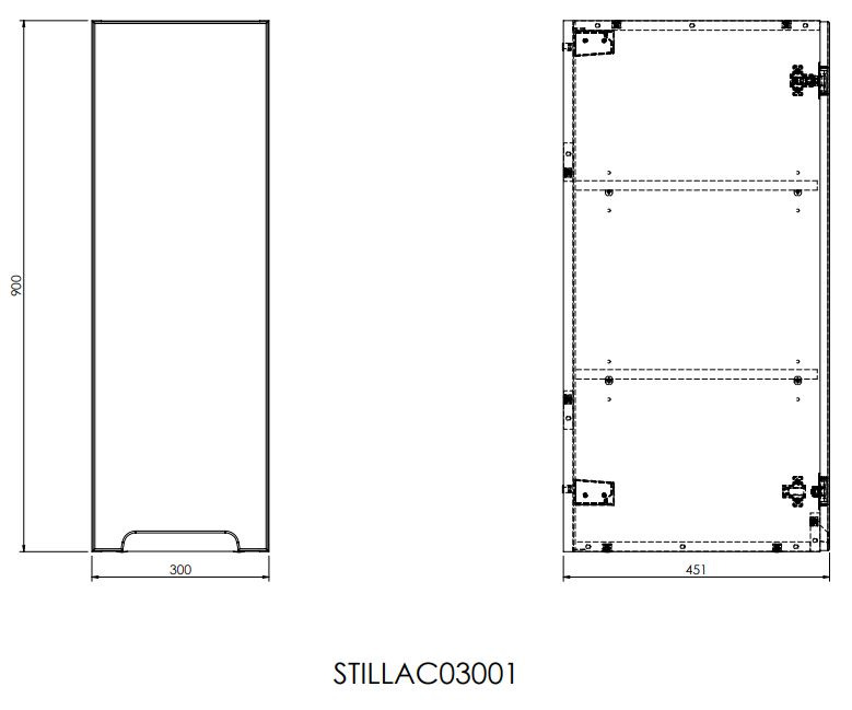 Armoire murale STILLAC3001 avec portes équipées d'un système de fermeture silencieuse. La porte peut être montée pour s'ouvrir à droite ou à gauche. Derrière la poignée fraisée se trouve une plaque distinctive qui souligne le caractère unique.