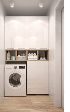 Meuble de salle de bain suspendu en blanc. Dimensions 30x90x45 cm. Face avant en mélaminé laqué. La porte a une ouverture à gauche et à droite. Le produit est livré démonté, avec instructions de montage.