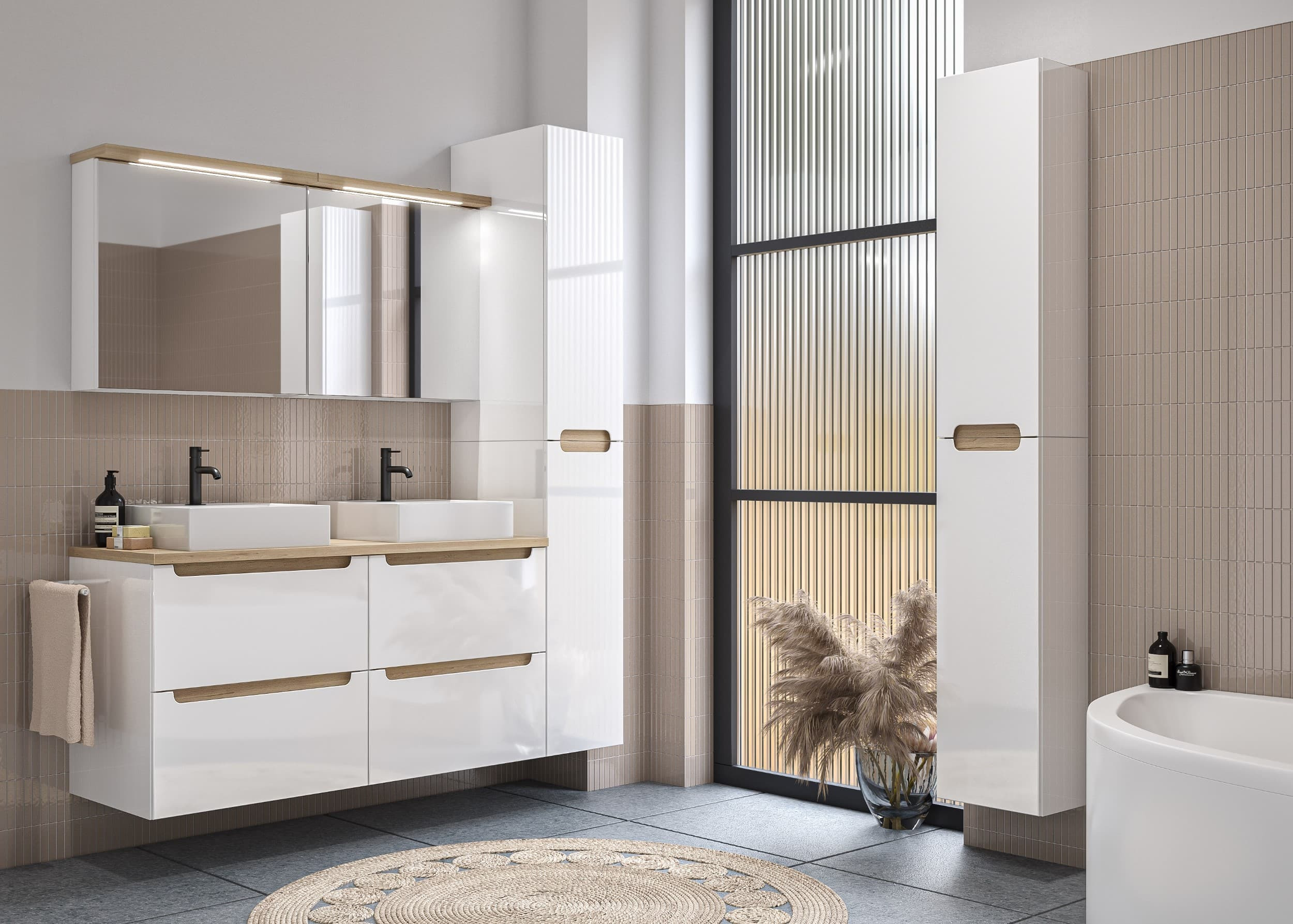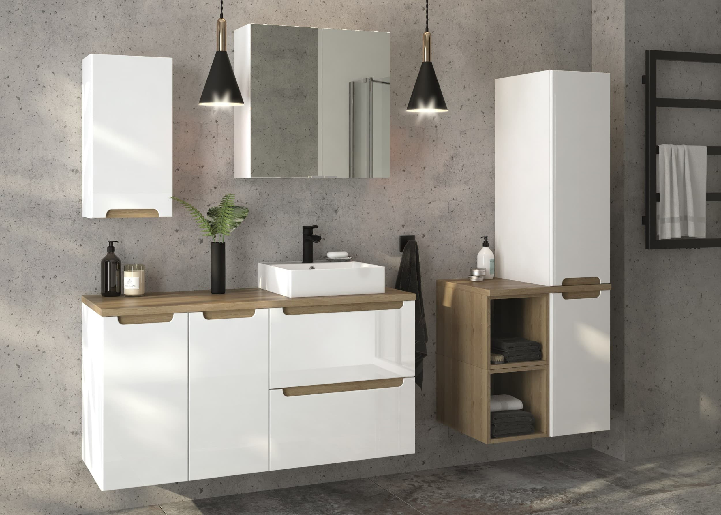 Le meuble est disponible en trois mélanges de couleurs : blanc brillant, noir béton et hêtre truffe, vous donnant la possibilité de décider de l'aspect final du meuble lors de l'installation, juste avant de l'accrocher. Chacune de ces couleurs souligne l’intérieur meublé de manière unique.