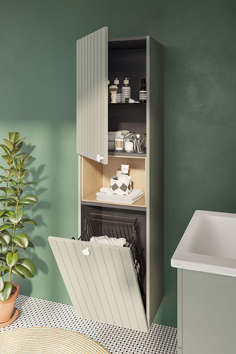 - Beauté mate - le placard suspendu pour accessoires de salle de bain 55x155x25 de couleur vert fjord mat avec poignées noires apporte fraîcheur et propreté à votre salle de bain, créant un espace plein de lumière et d'élégance.