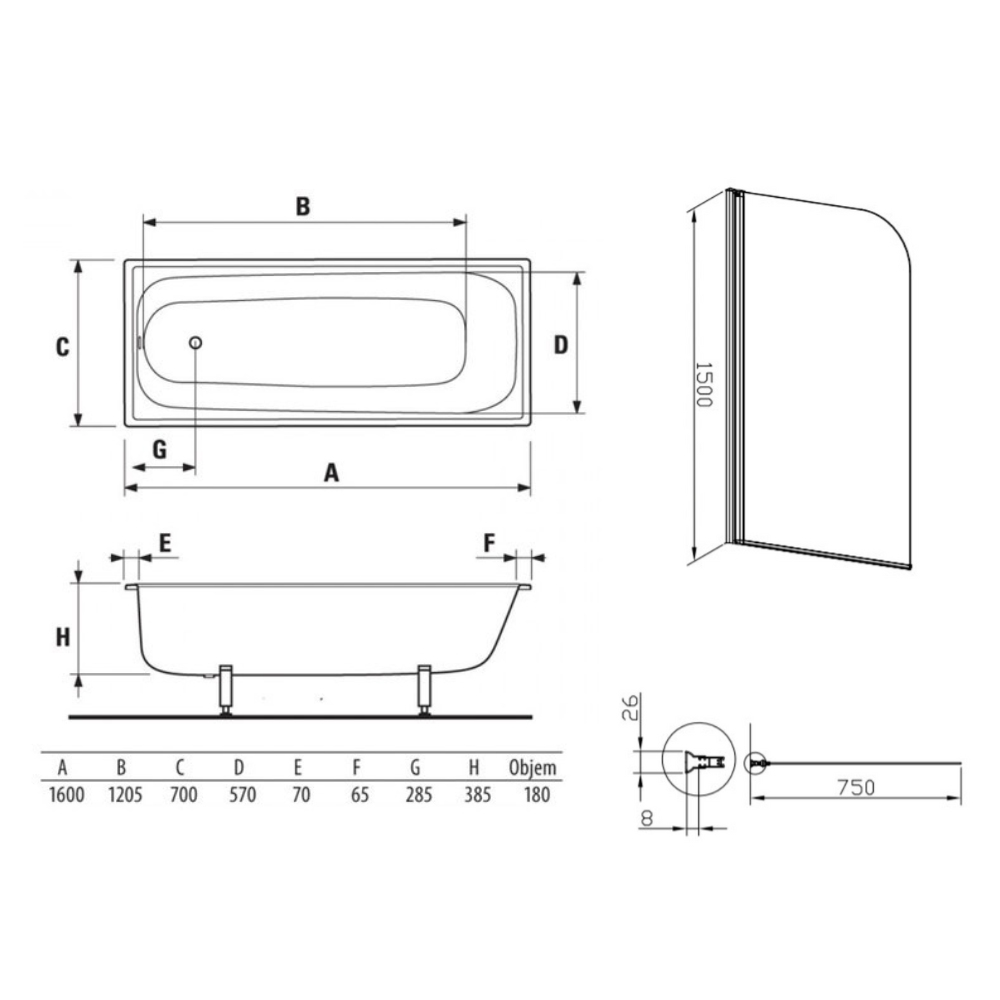 Contenu de l'ensemble baignoire 160x70 cm Riga universelle + Pare baignoire pivotant chrome + pieds (3406-SETP):