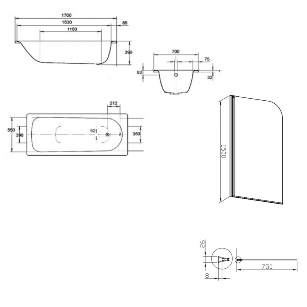 Contenu de l'ensemble baignoire 170x70 cm Eurowa universelle + Pare baignoire pivotant chrome + pieds (KW312-SETP1):