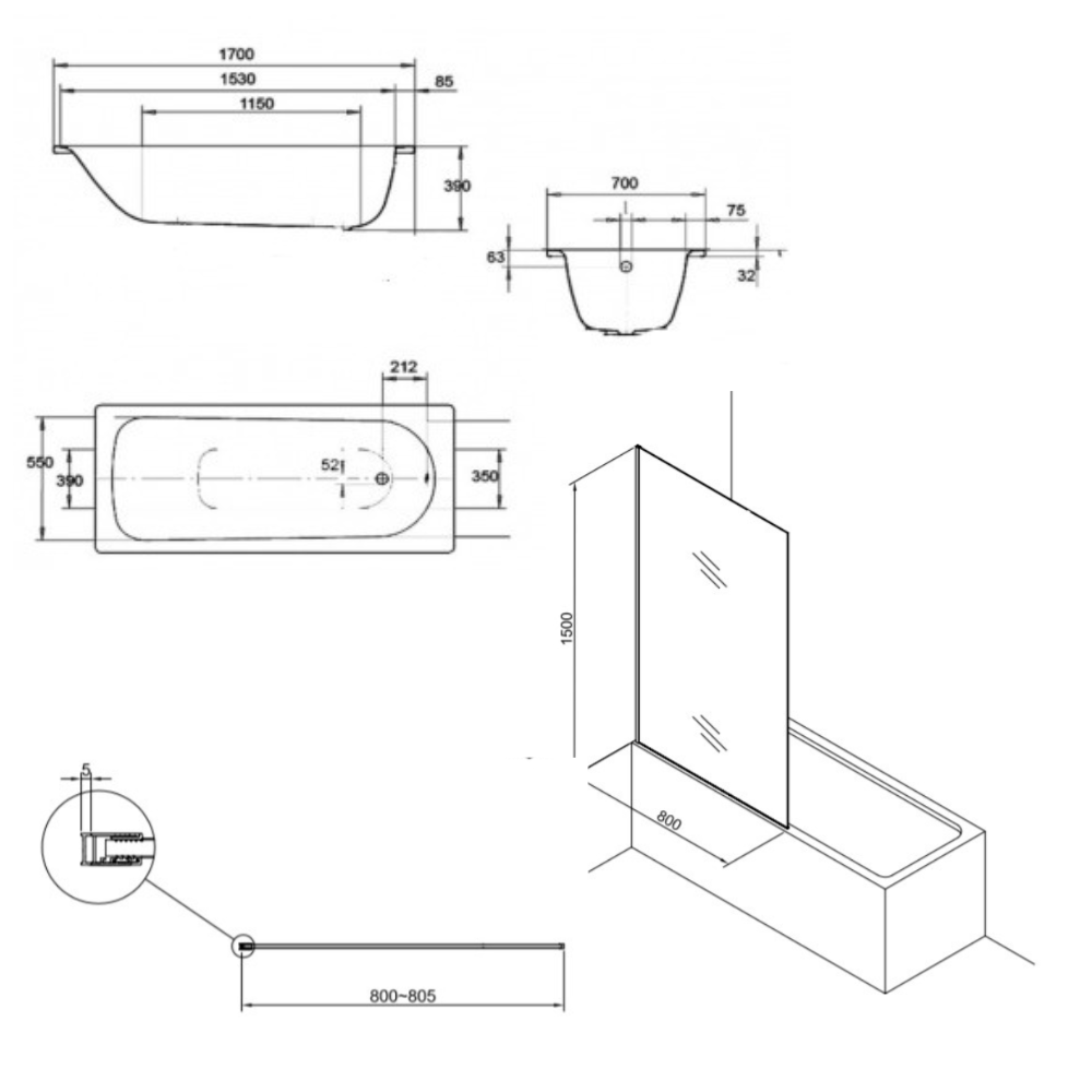 Contenu de l'ensemble baignoire 170x70 cm Eurowa universelle + Pare baignoire fixe chrome + pieds (KW312-SETP3):