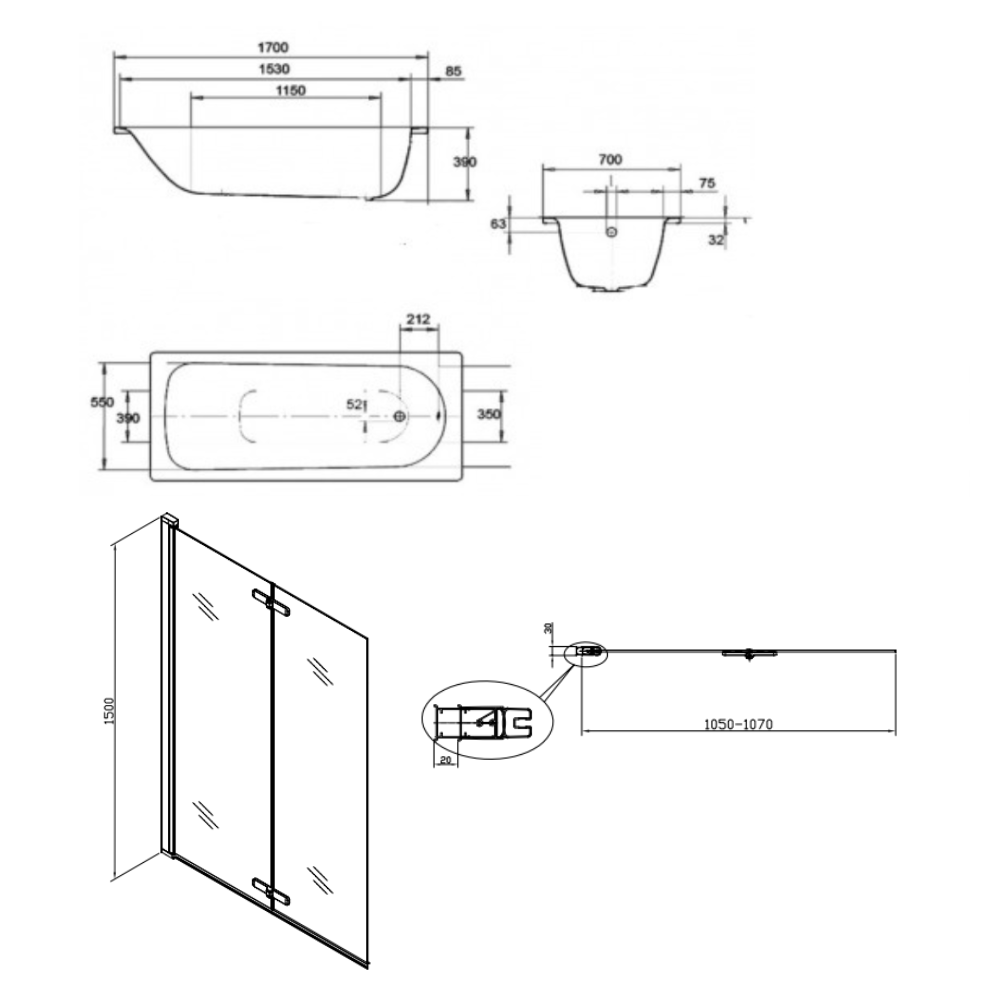 Contenu de l'ensemble baignoire 170x70 cm Eurowa universelle + Pare baignoire pliable, 2 volets noir + pieds (KW312-SETP4):