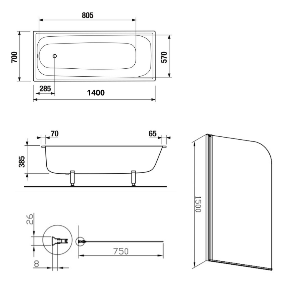 Contenu de l'ensemble baignoire 140x70 cm Riga universelle + Pare baignoire pivotant chrome + pieds (A140-SETP):