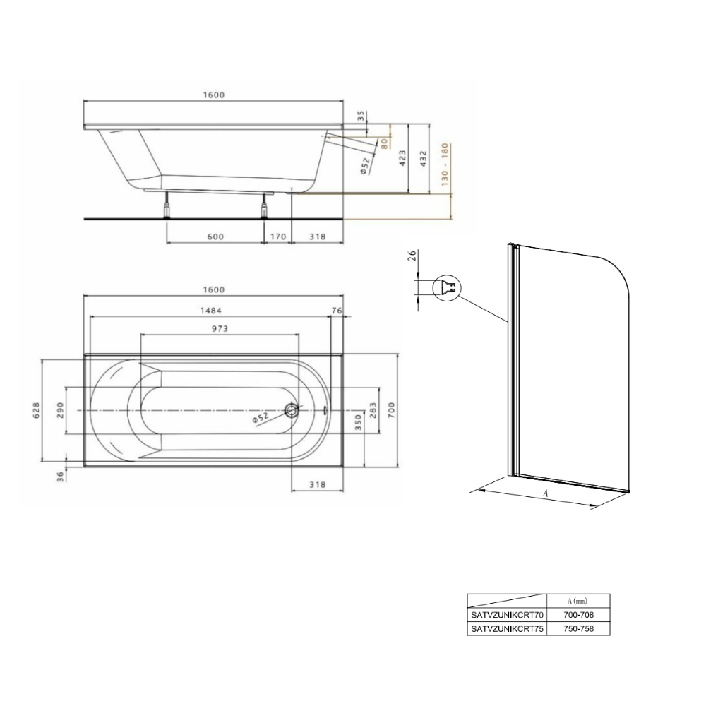 - Possibilité de placer le pare-baignoire à gauche, ou à droite