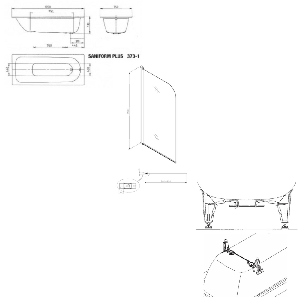 Contenu de l'ensemble baignoire 170x75 cm Saniform universelle + Pare baignoire pivotant noir + pieds (KW3731-SETP5):