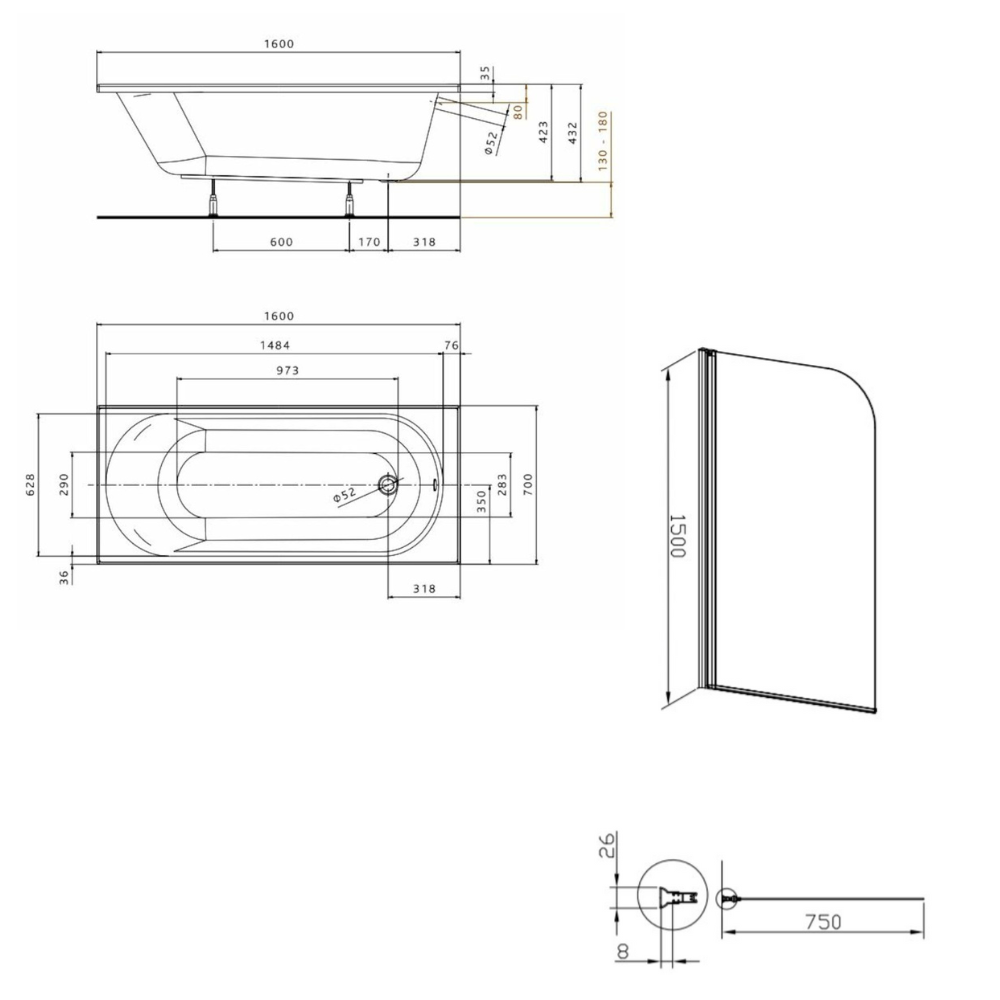 Contenu de l'ensemble baignoire 160x70 cm Opal Plus universelle + Pare baignoire pivotant chrome + pieds (XWP1260000-SETP1):