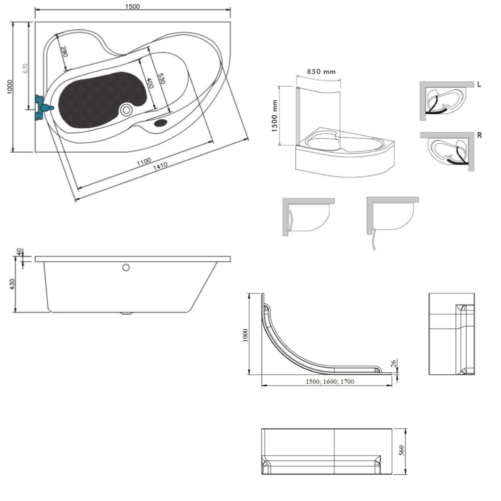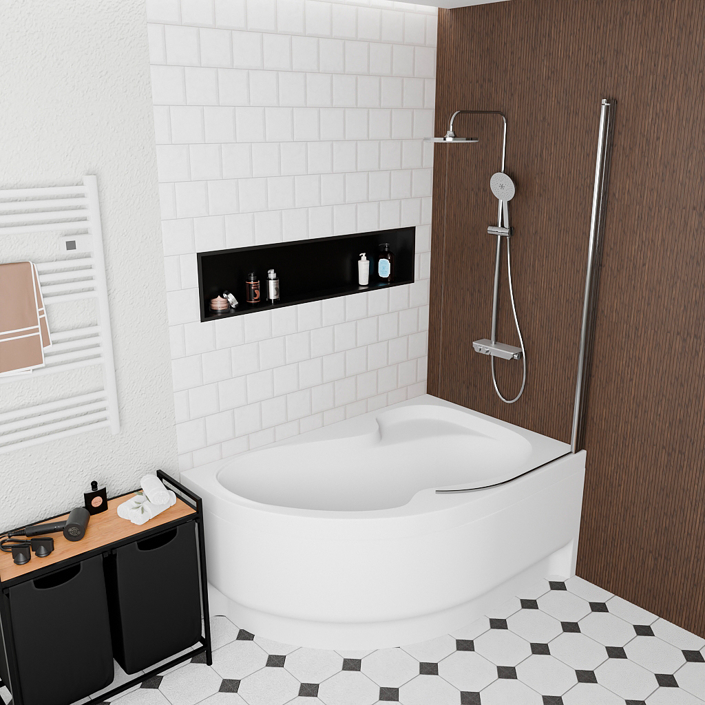 Caractéristiques de la baignoire asymétrique en acrylique, 150x100 cm, droite + tablier 150 cm + pare-baignoire + pieds, Siko Laguna Fortuna Plus, blanc (FO1500PPLUS-SETP1) :