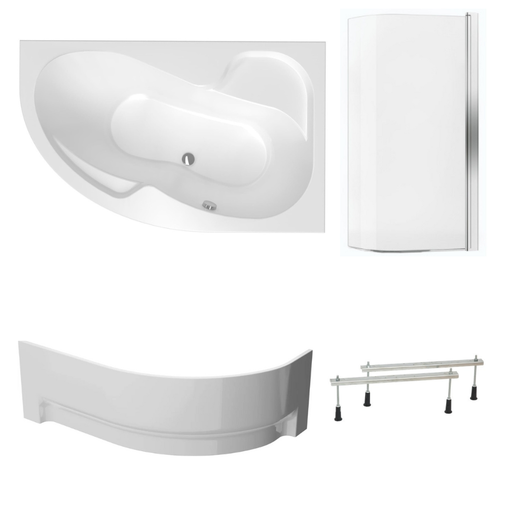 Siko 150x100 cm Fortuna Plus baignoire asymétrique en acrylique, droite + tablier + pare-baignoire + pieds, blanc (FO1500PPLUS-SETP1)