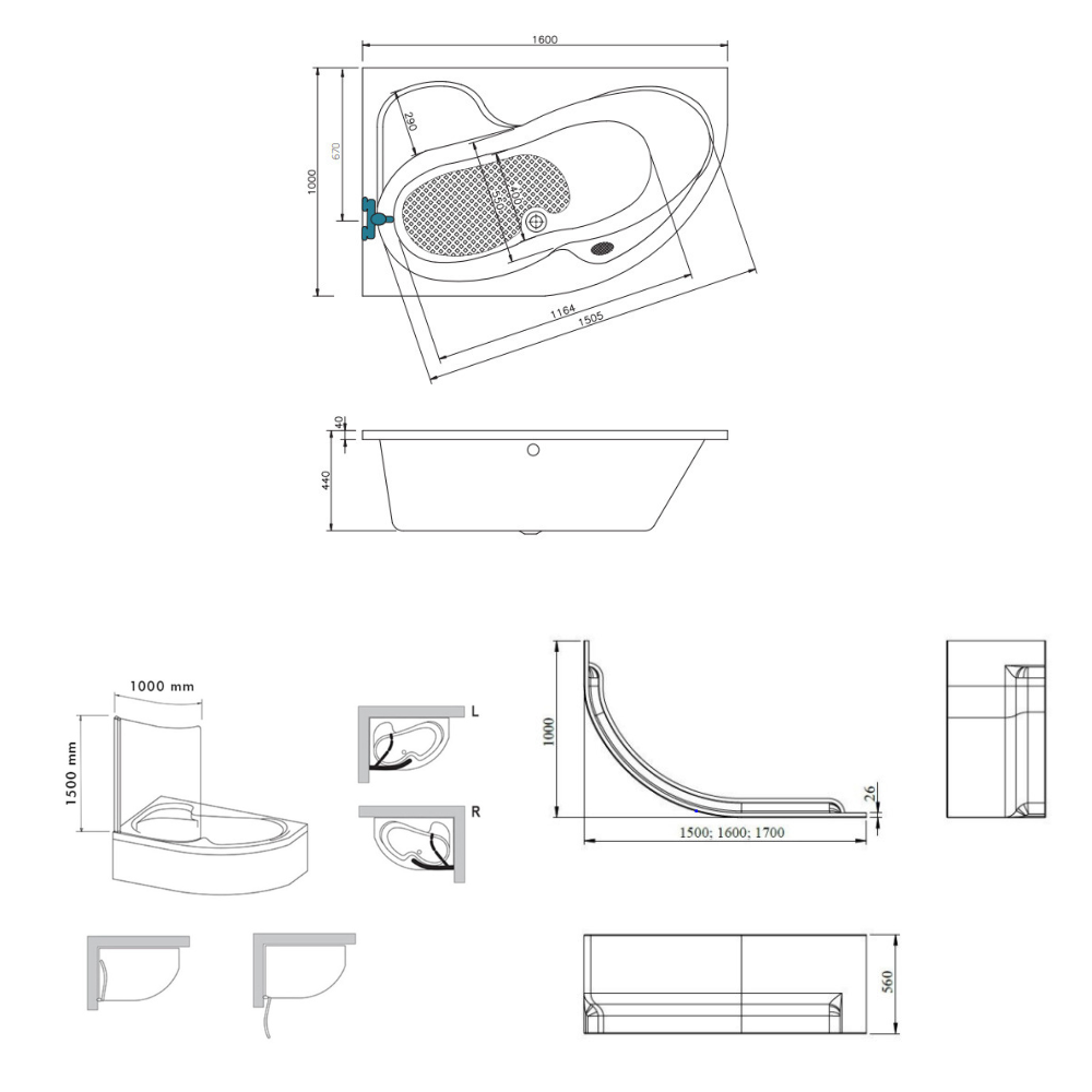 Caractéristiques de la baignoire d'angle en acrylique, 160x100 cm, gauche + tablier 160 cm + pare-baignoire + pieds, Siko Laguna Fortuna Plus, blanc (FO1600LPLUS-SETP1) :