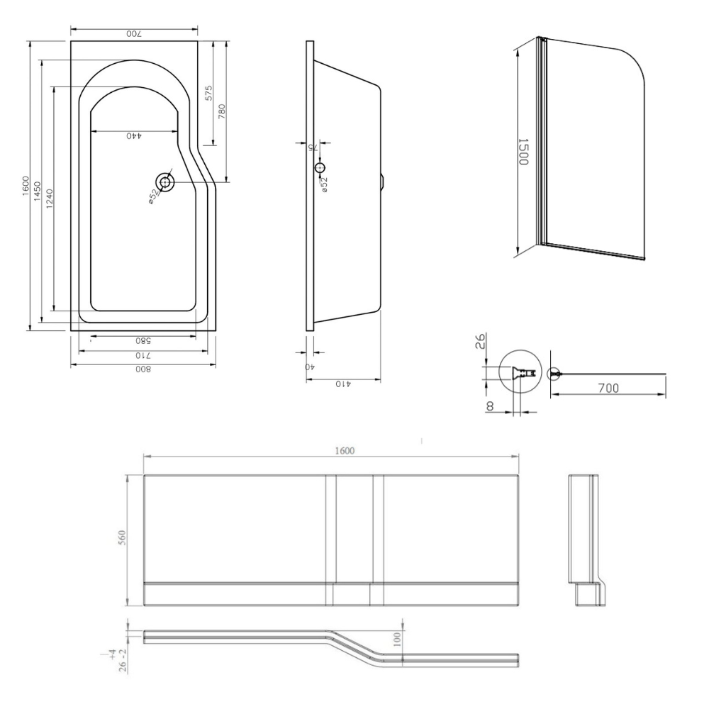 - Type de produit:Baignoire bain/douche asymétrique avec tablier, pare-baignoire et pieds
