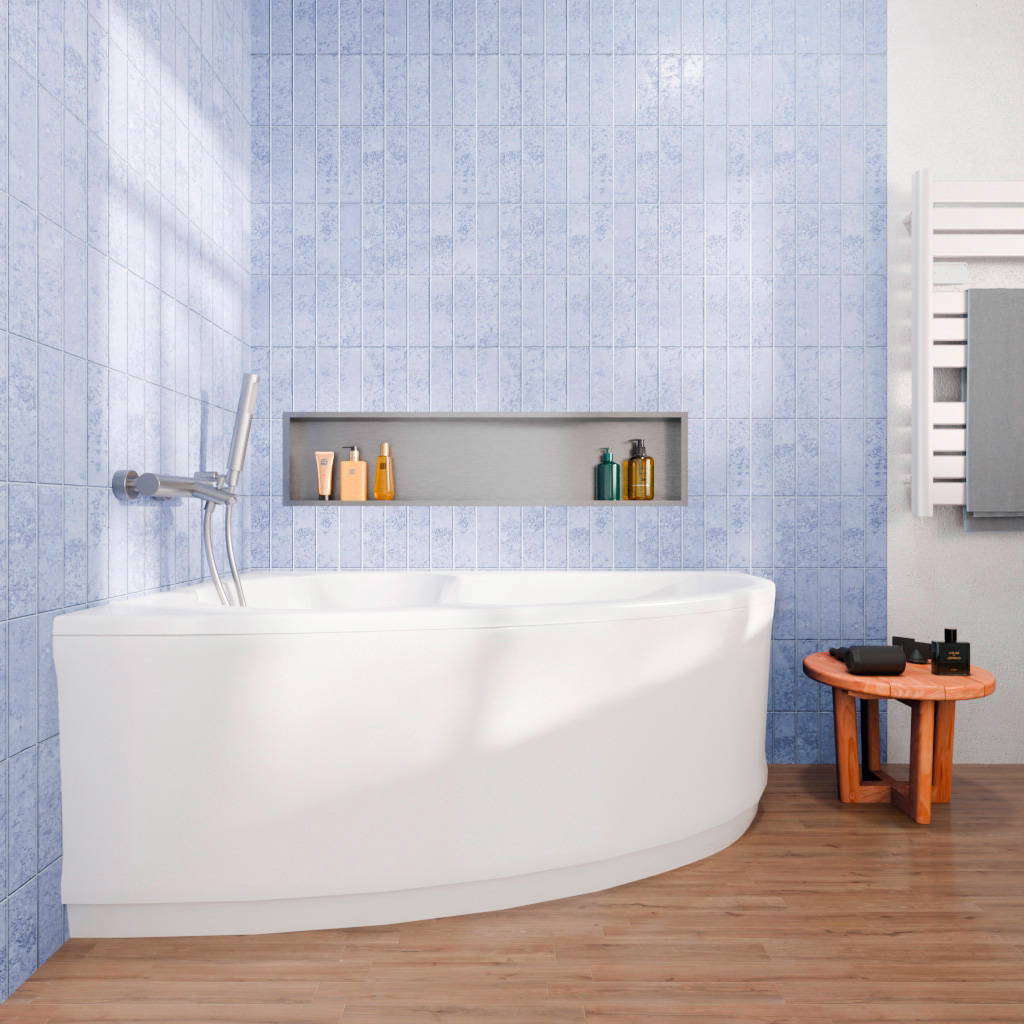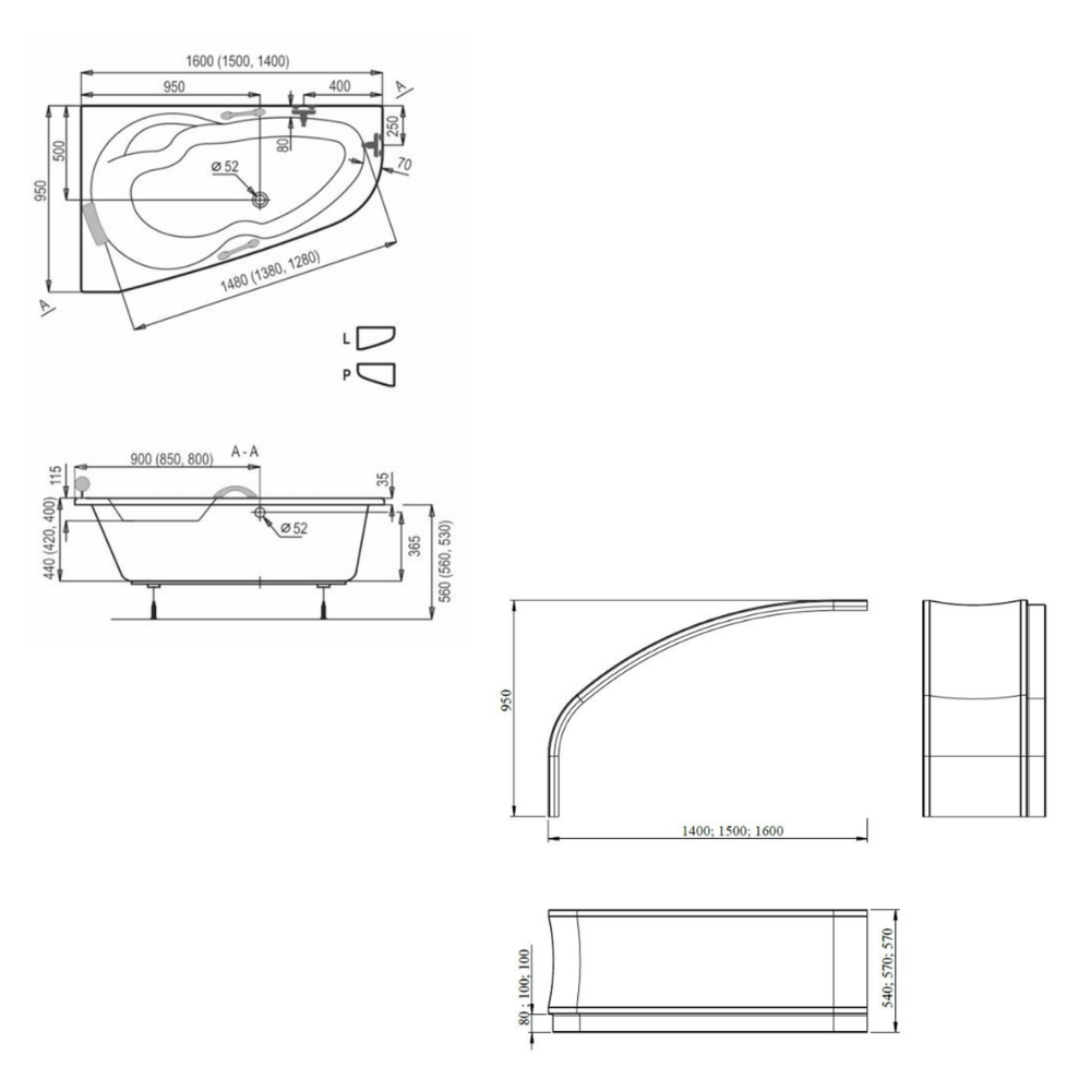 Caractéristiques de la baignoire asymétrique en acrylique, 150x95 cm, gauche + tablier 150 cm + pieds, Siko Laguna Luiza, blanc (LU1500L-SET1) :