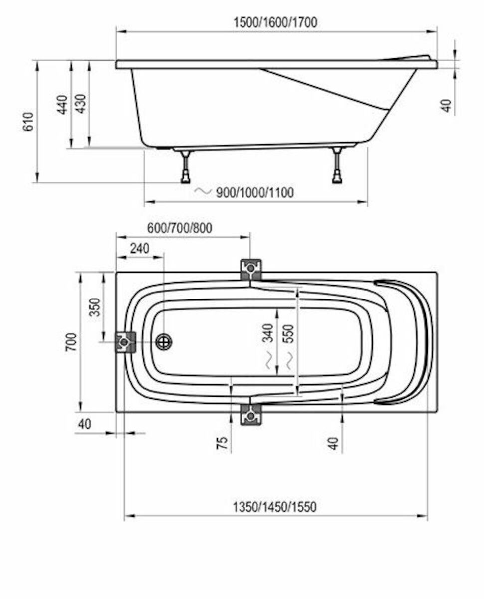 - Pour les baignoires rectangulaires de 70 cm de largeur