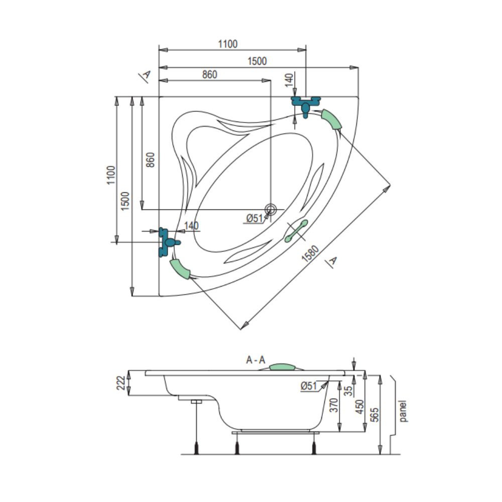 Caractéristiques de la Baignoire d'angle avec pieds Siko Laguna Royale, 150x150 cm, Acrylique, Gauche et Droite, Blanc (RO1500NEW-SET) :