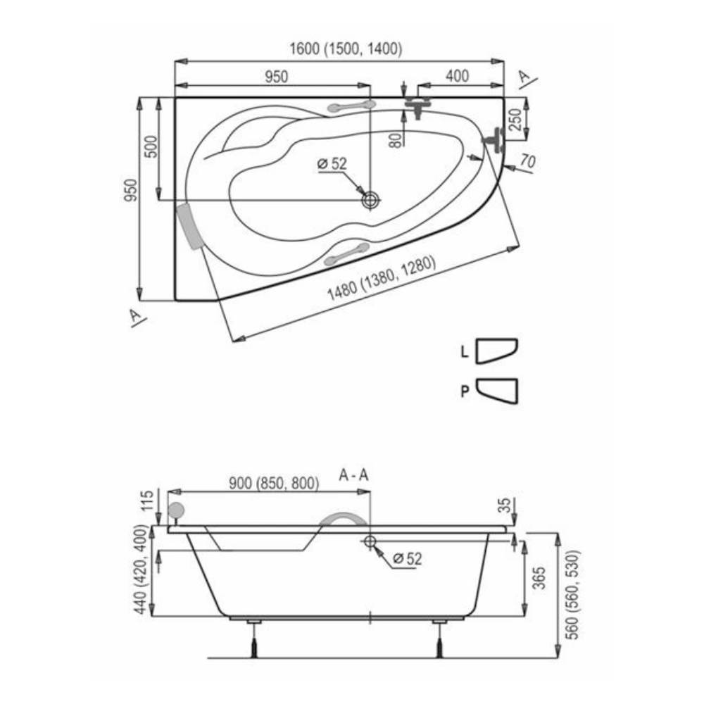 Caractéristiques de la baignoire asymétrique avec pieds Siko Laguna Luiza, 150x95 cm, acrylique, gauche, blanc (LU1500L-SET) :