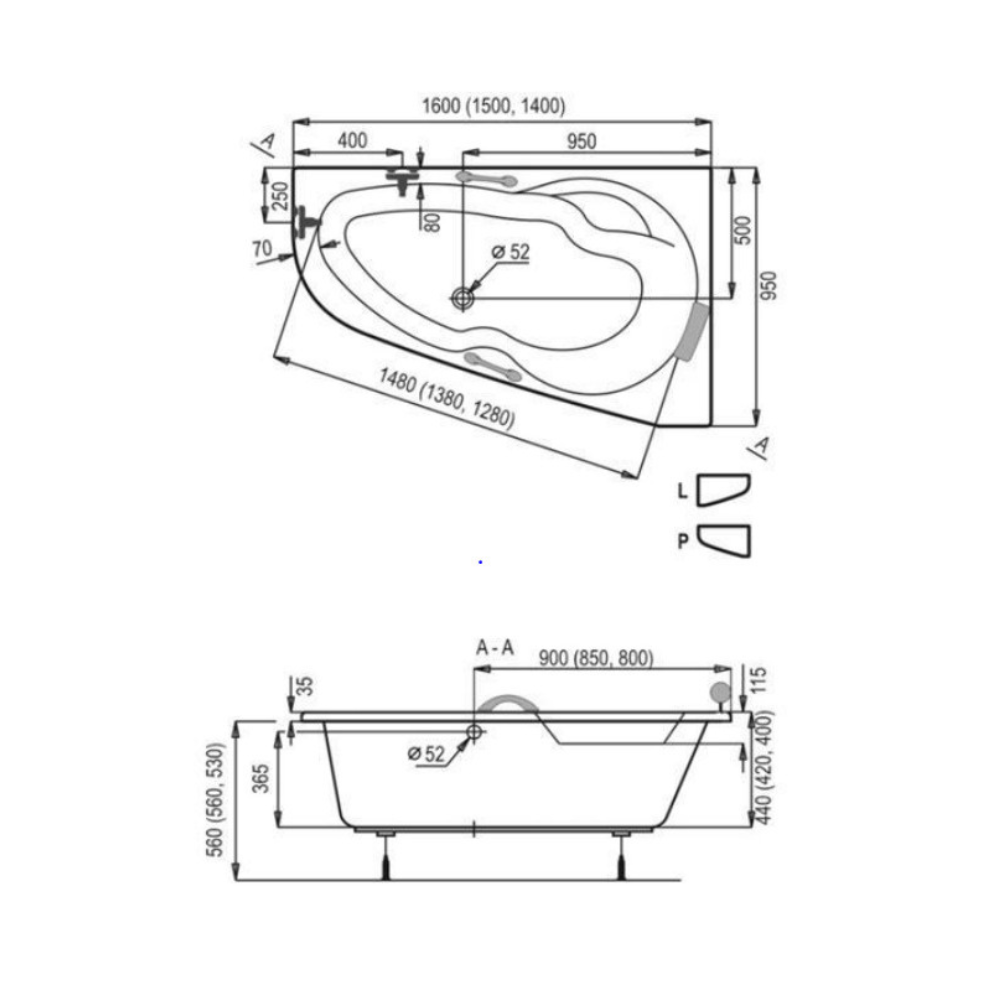 Caractéristiques de la baignoire d'angle avec pieds Siko Laguna Luiza, 160x95 cm, acrylique, droite, blanc (LU1600P-SET) :