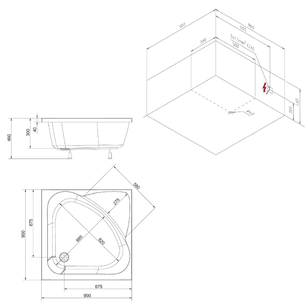 Caractéristiques de la baignoire d'angle gain de place 90x90 cm, 95 L en acrylique, avec pieds, orientation droite, Polysan Carmen, blanc (29611-SET) :