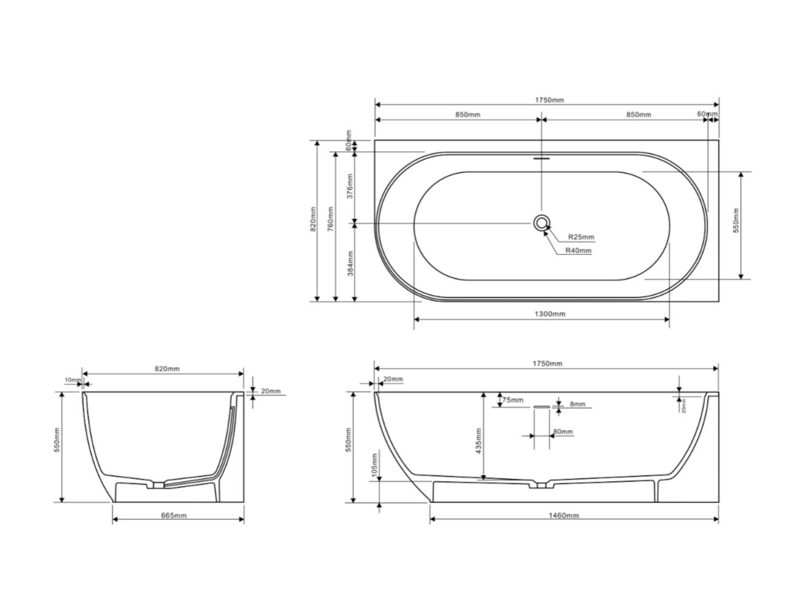Nelly 175x82 cm Baignoire droite Autoportante orientation droite en marbre coulé, sans pieds, blanc (NEL1700P)