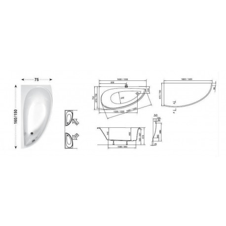 Caractéristiques de la Baignoire d'angle, style asymétrique gain de place, orientation gauche 160x75 cm, Acrylique blanche, Ravak Avocado (CQ01000000) :