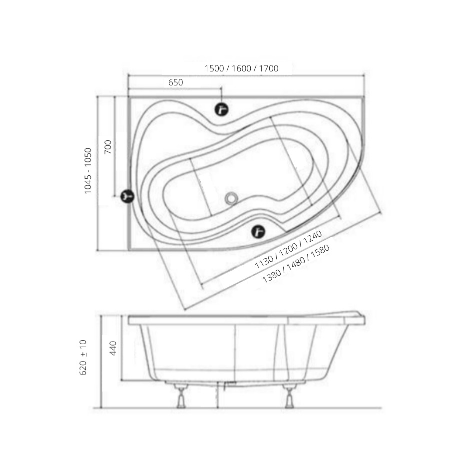 Caractéristiques de la Baignoire asymétrique 160 x 105 cm orientation gauche, Acrylique, Blanc, Ravak Rosa II (CM21000000) :