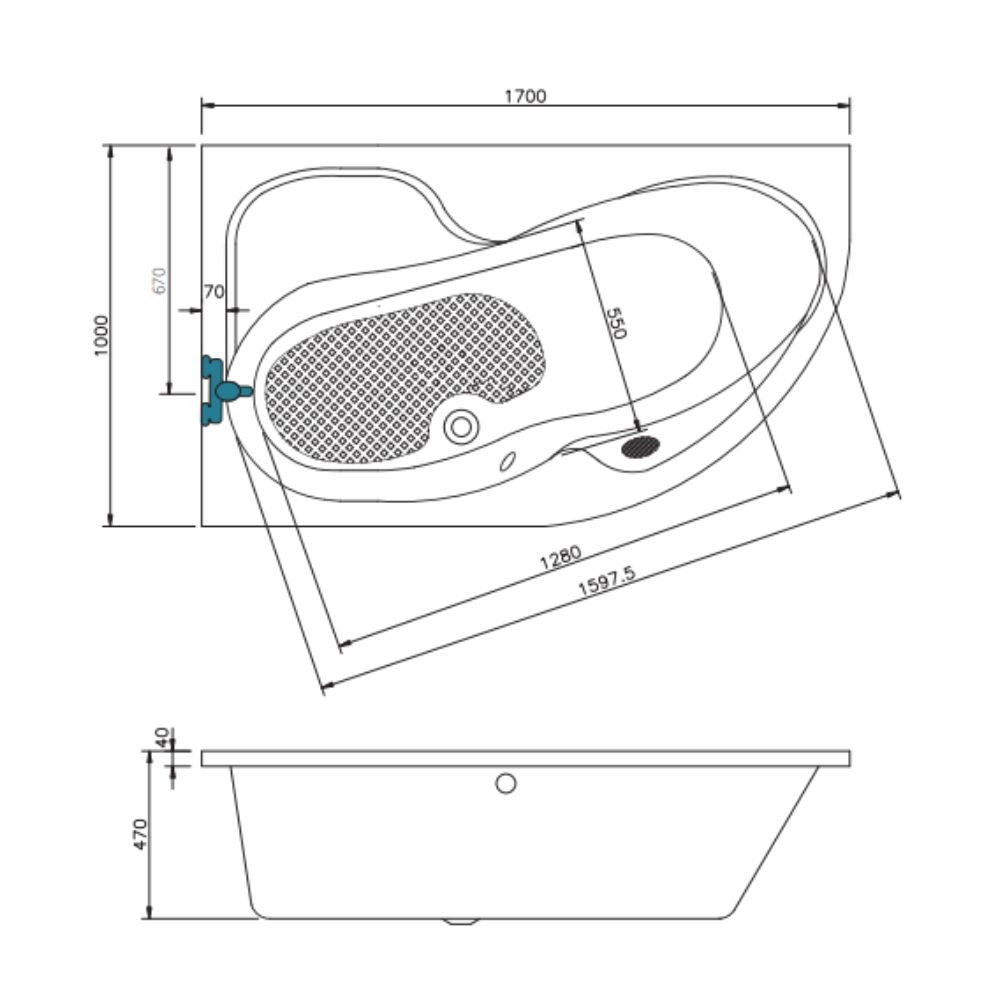 Baignoire asymétrique orientation gauche en acrylique blanche d'une épaisseur de 5 mm, le volume de la baignoire est de 220 litre, avec des dimensions de 170x100 cm.