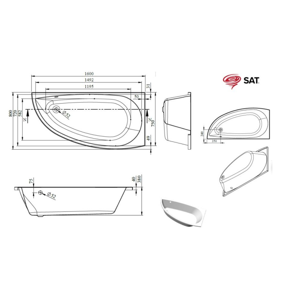 Caractéristiques de la baignoire asymétrique SAT Poli, 160x80 cm, acrylique, droite, blanc (SATPOLI1600P) :