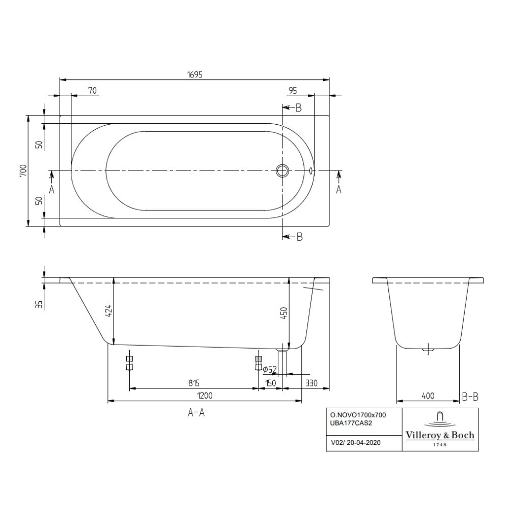 Caractéristiques de la Baignoire rectangulaire, 170 x 70 cm, Villeroy & Boch O.NOVO, Blanc (UBA177CAS2V-01) :