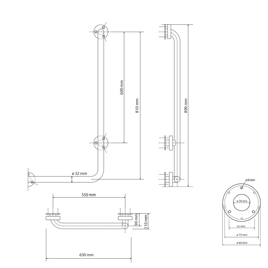 Caractéristiques de la Barre de maintien fixe 63x89 cm, en forme de L, pose à droite, Acier Inoxydable, Bemeta HELP (301122041) :