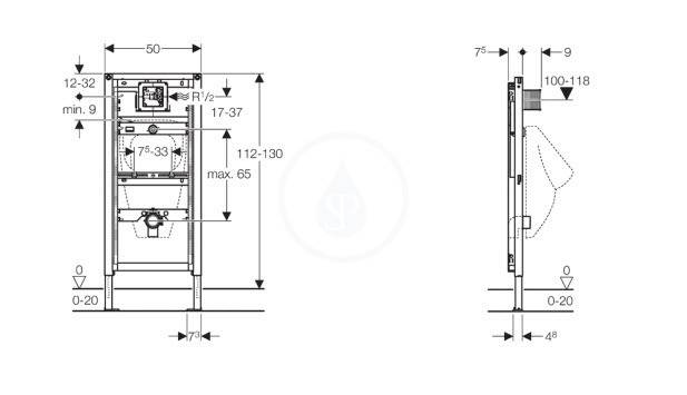 - Hauteur de l'élément adaptable à l'urinoir, 112–130 cm