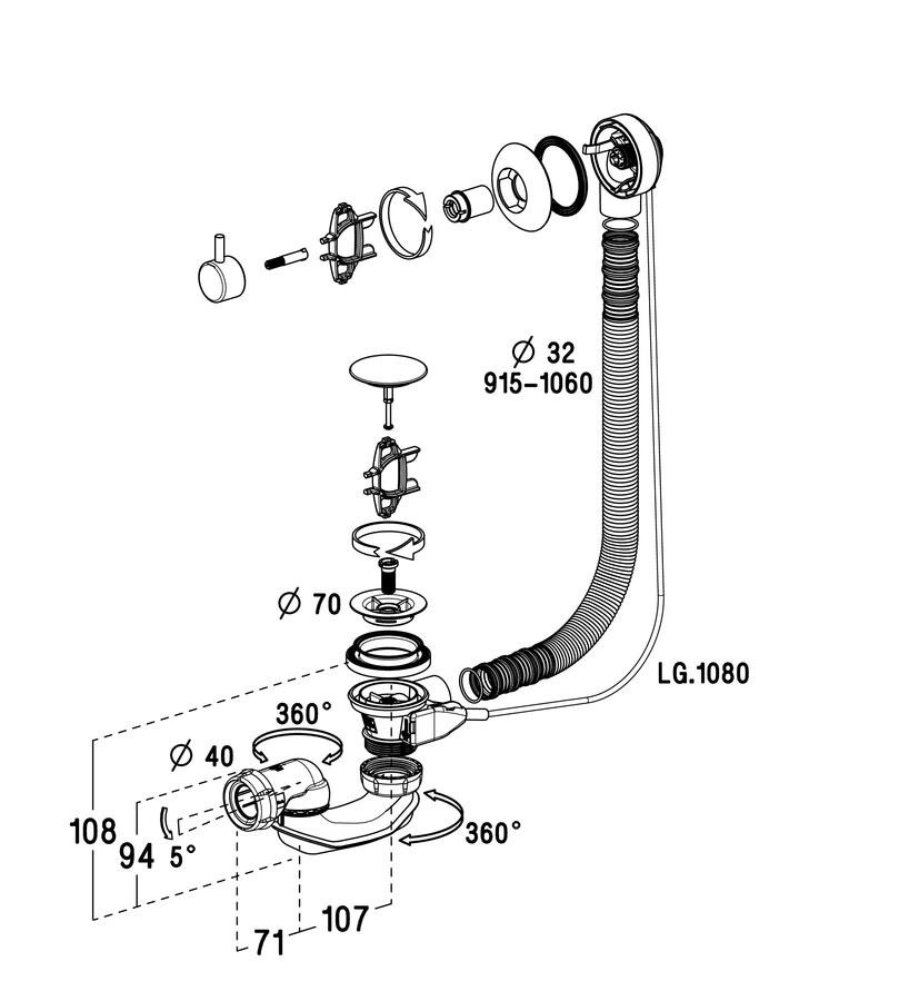 Caractéristiques du Vidage baignoire avec câble 1 mètre, Débit de 70l/min, Rotule orientable à 360°, Ajustable en hauteur, Nicoll Easybain (0203614) :