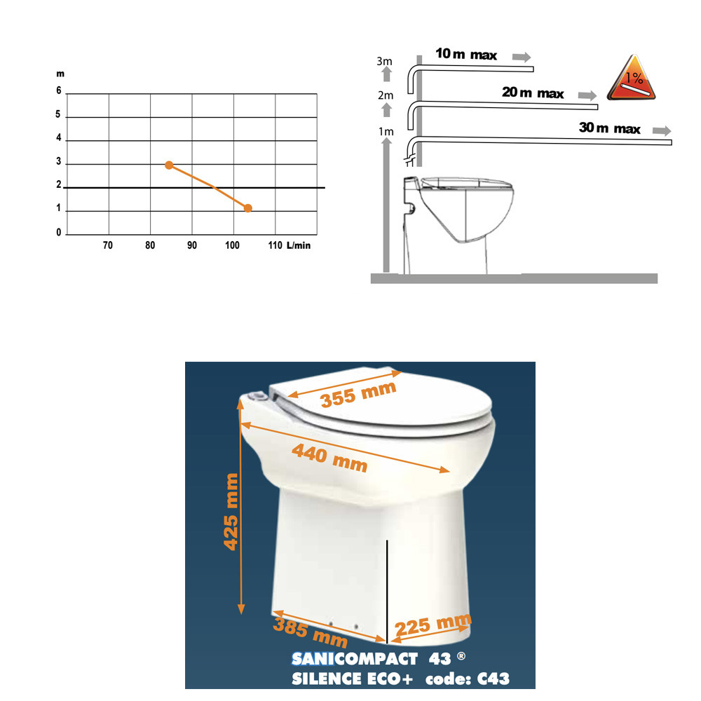 Caractéristiques du Sanicompact 43 éco+ WC compact avec broyeur sanitaire, silencieux, 1 entrée disponible pour lave-mains Blanc (C43LV):