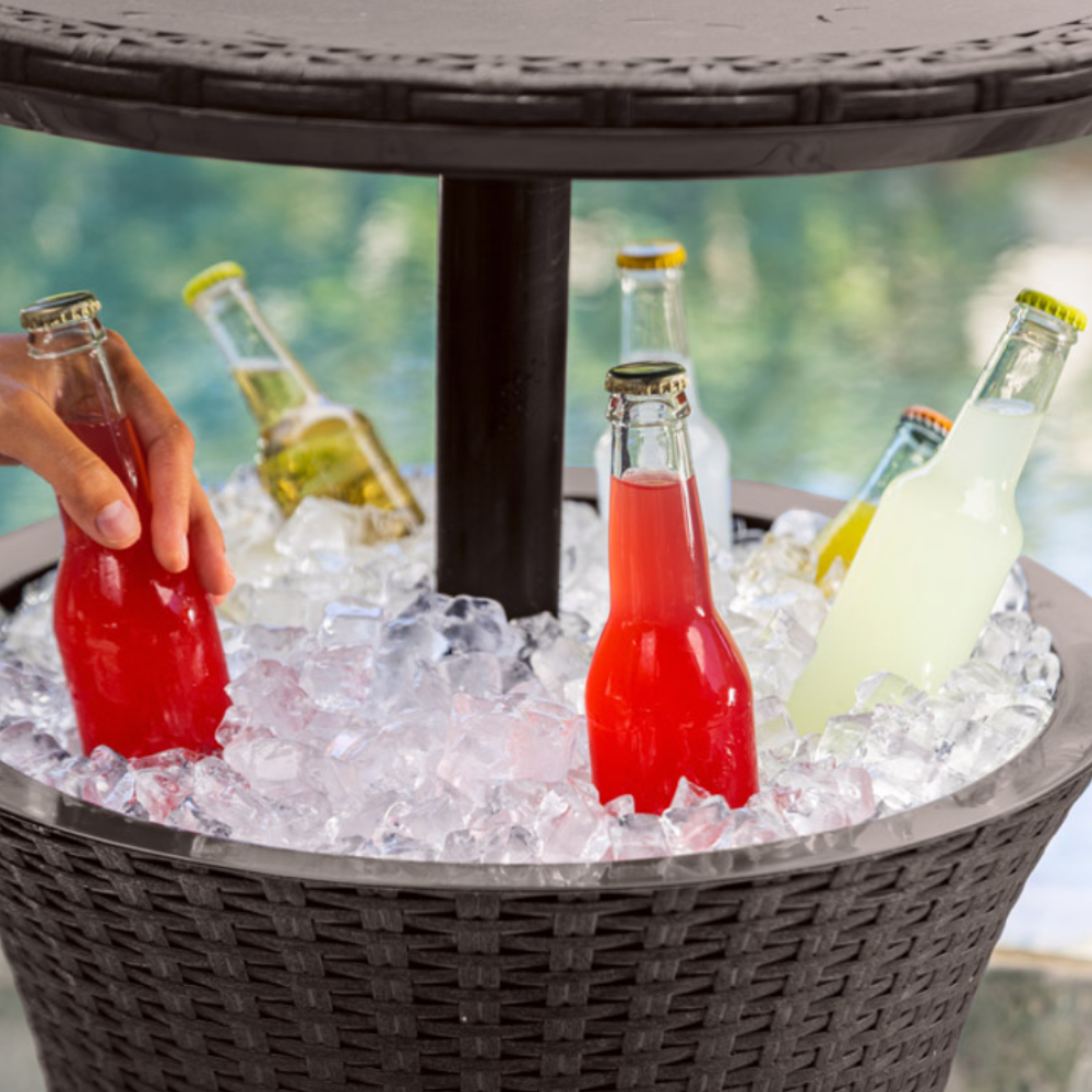 - Bar de jardin multifonctionnel qui, une fois plié, sert de table pratique et, une fois déplié, peut servir de bar classique avec une boîte pour refroidir les boissons.