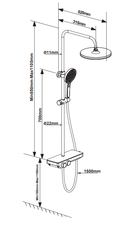 - Hauteur de la colonne de douche réglable de 85 à 110 cm