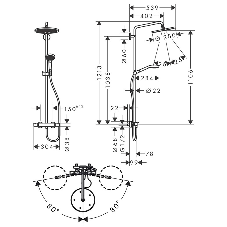 Caractéristiques du showerpipe 280 1 jet avec thermostatique, Bronze brossé Hansgrohe Croma Select S (26890140) :