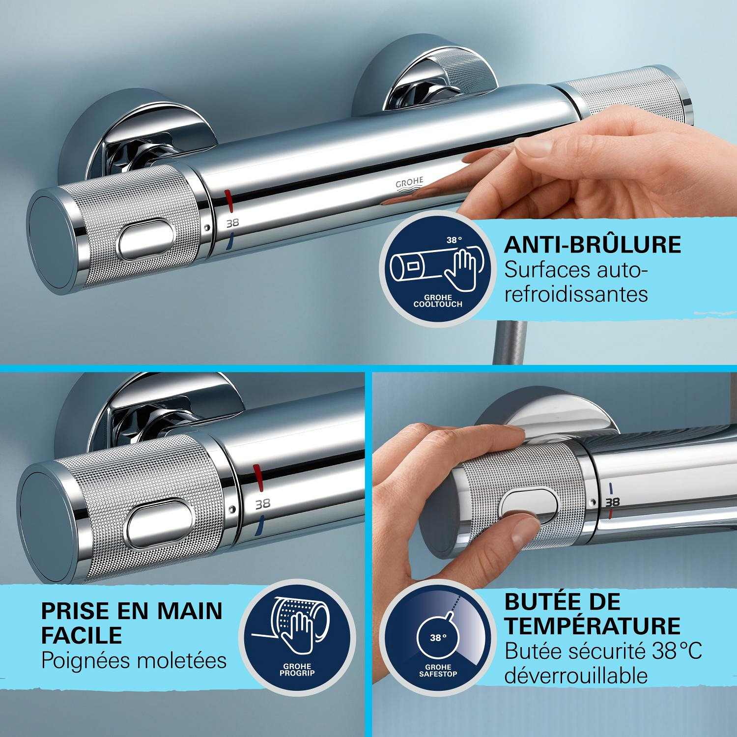- GROHE TurboStat Régulation de la température quasi-instantanée et sécurité anti-brulûres en cas de coupure d'eau froide