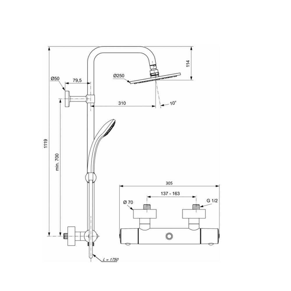 - Mitigeur thermostatique avec poignée de réglage de la température et limiteur pré-réglé de 40° C.